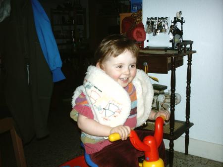 Avec ma moumoutte à l'envers sur mon tricycle, je m'amuse super bien.